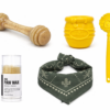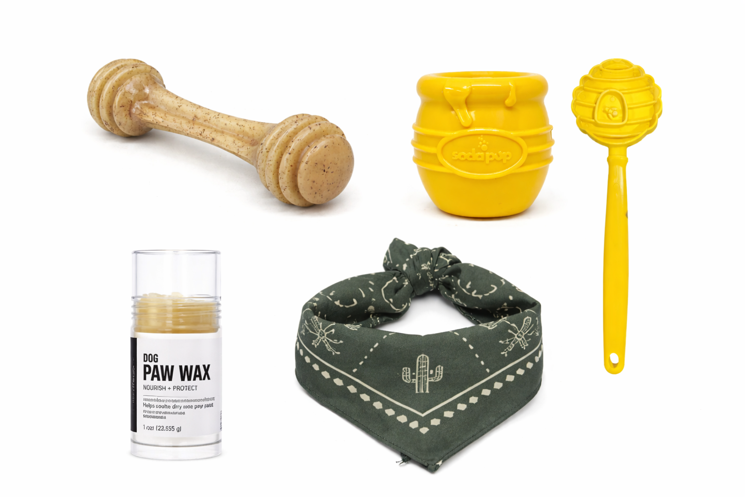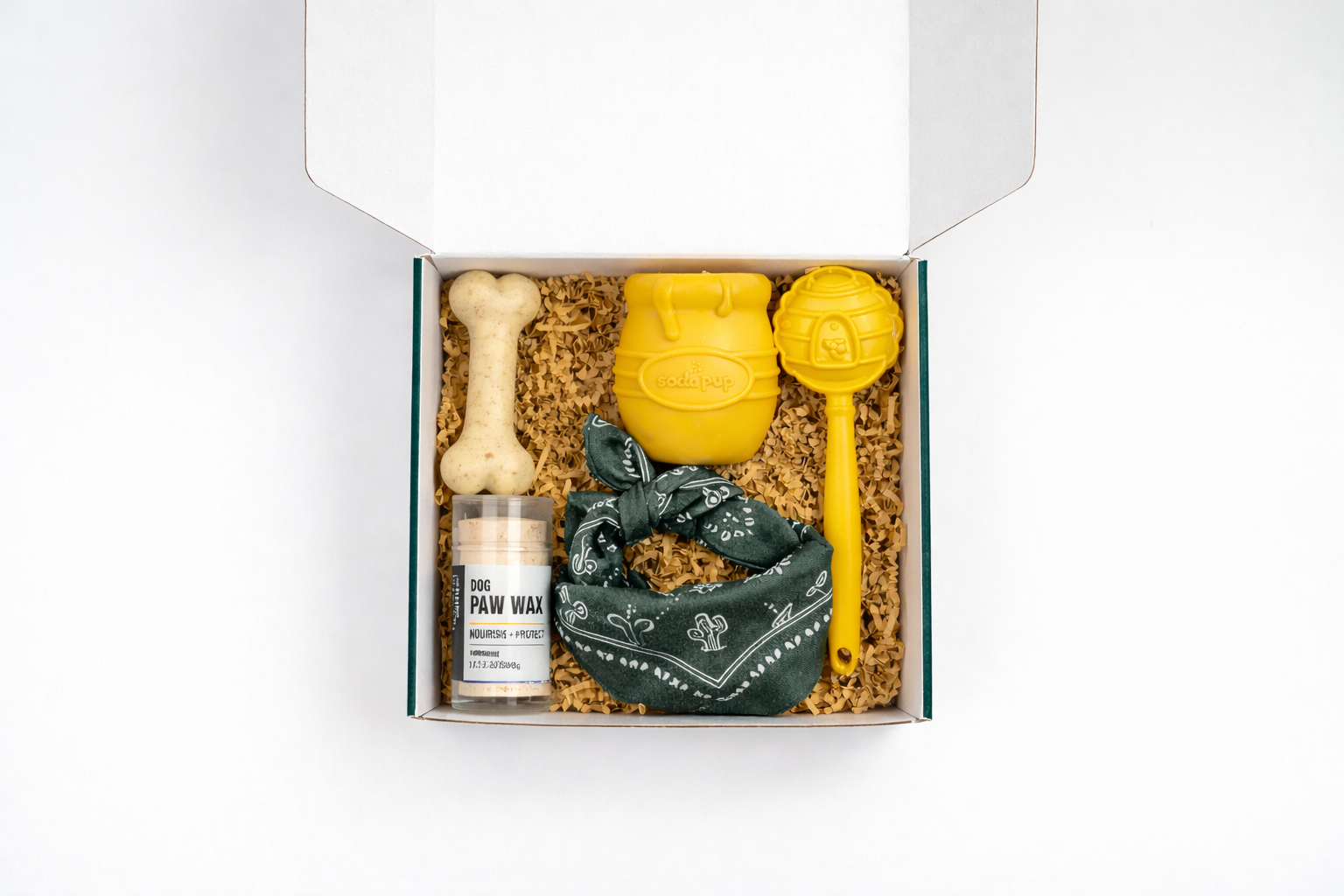 A thoughtfully curated pet gift box featuring durable toys, paw-care essentials, and a stylish bandana, perfect for treating a very good dog.