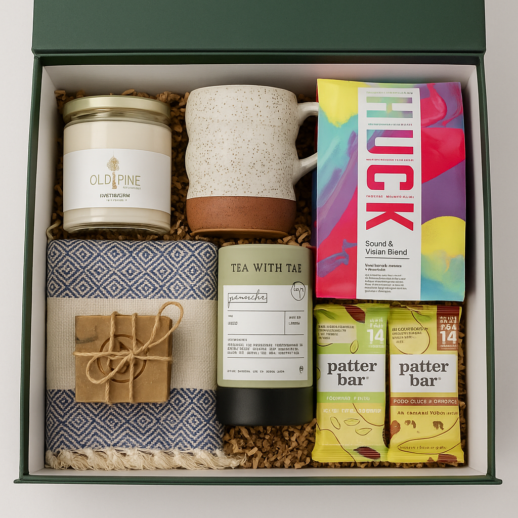 A curated Colorado-made gift box featuring a handmade ceramic mug, local tea, seasonal candle, Turkish towel, artisan coffee, snack, and soap; designed to elevate your morning ritual.